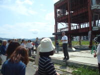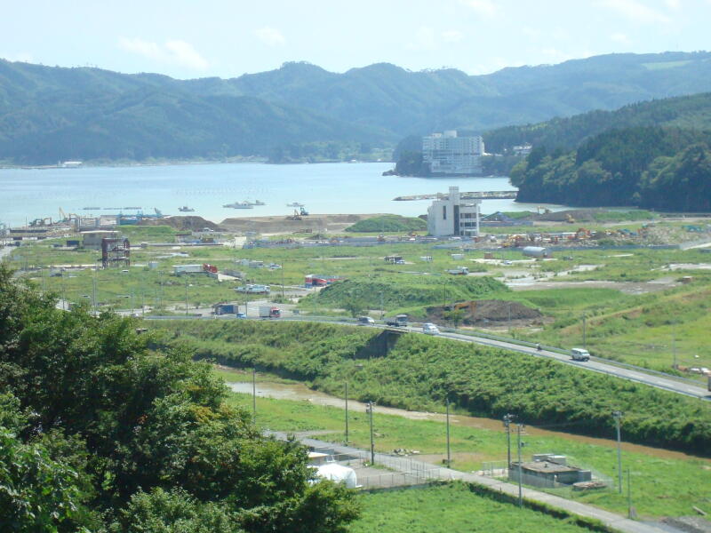 | 海岸の近くも通り、どのあたりまで津波が到達したのかの説明も伺った。峠を越えて志津川地区に入ると、下り坂の途中から、津波の被害を受けた地域が始まり、その痕跡が見られた。JR気仙沼線は、一部は線路を舗装してバスが走っているが、一般道にも迂回する部分も多く存在する。そのバスとも何度かすれ違った。海岸に到達すると、まだ津波で破壊された堤防などが見られた。市街地はほぼ更地の状態になっており、避難者が集まっていた公立志津川病院は撤去され、コンクリートの建物としては、病院に隣接の高野会館のみであった。 | |||