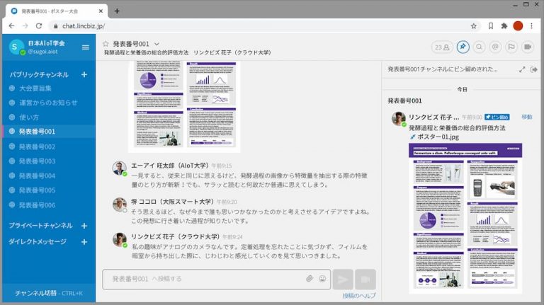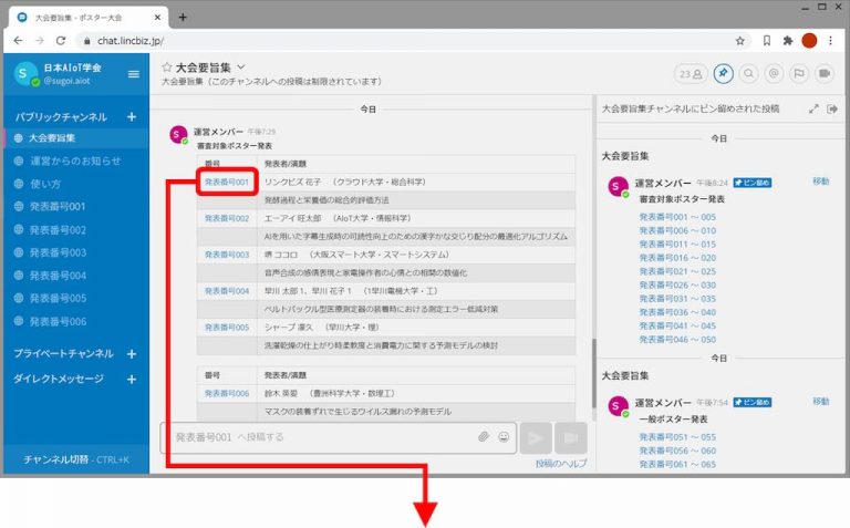 ◆LINC Bizに接続した時の画面を下の図に示します。左側の青の背景の部分には、様々なチャンネルが一覧表示され、その中の目次に相当するところをクリックすると一番上の図のように、ポスター発表の一覧が表示されます。