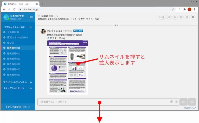 ◆発表者は、それぞれにチャンネル(各発表者用の個別のページ)が設定され、そこにポスターを投稿(アップロード)していただきます。