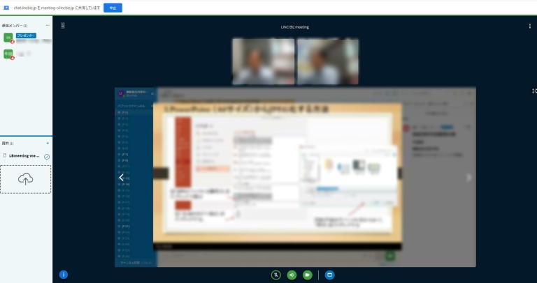 ◆下の図は、ビデオ会議中の画面です。発表者1人と閲覧者1人で、ポスターが画面共有されている状態です。この写真では、LINC Biz内の画像を共有していますが、発表者のPC内のファイルの共有も可能です。
